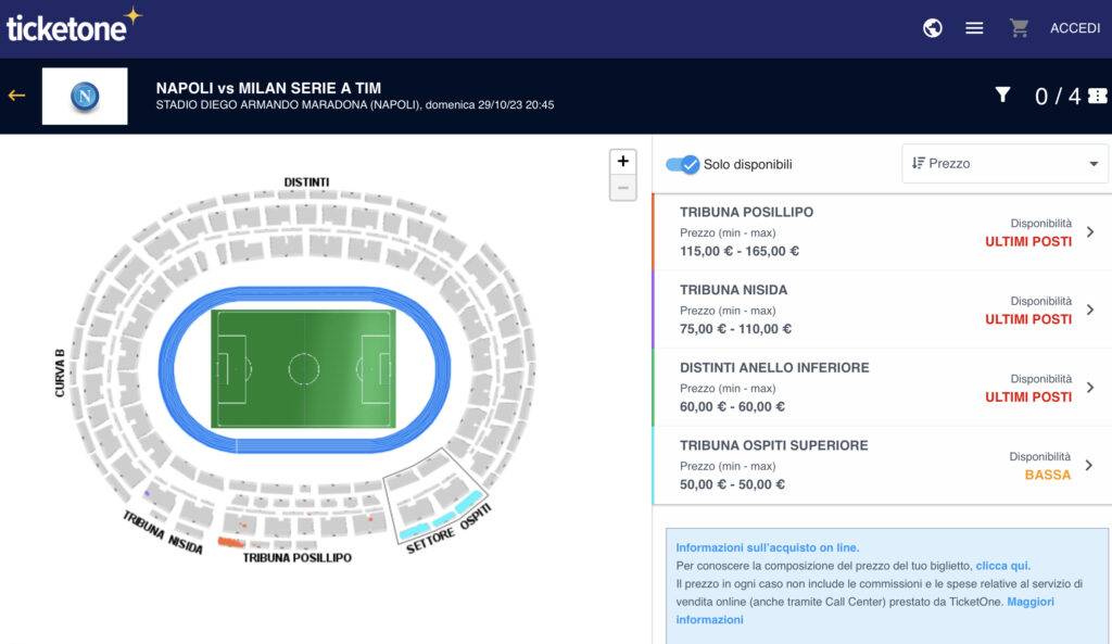 Sarà un Maradona esaurito in tutti gli ordini di posti quello che domani sera accoglierà Napoli e Milan nel big match della giornata. Restano infatti disponibili solo alcuni biglietti dell’anello superiore di Tribuna Posillipo e Tribuna Nisida, ed alcuni tagliandi per il settore distinti inferiori e per il settore ospiti come si vede dalla situazione esposta da Ticketone dopo le ore 16 di oggi.