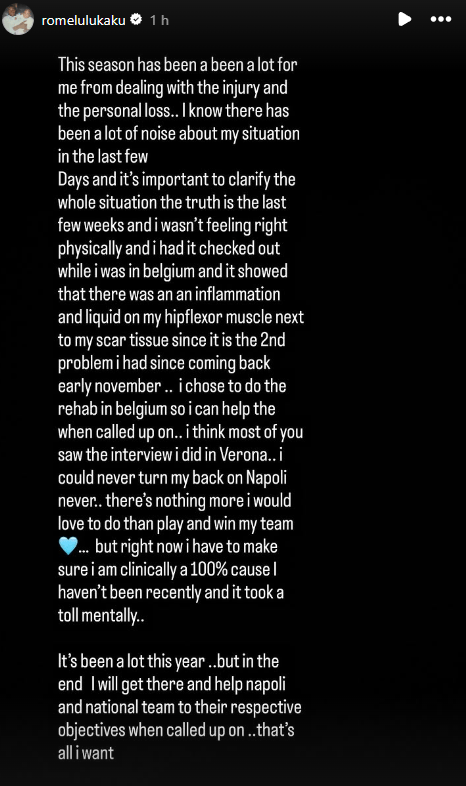 Romelu Lukaku, attaccante del Napoli, ha spiegato, tramite una serie di storie Instagram, il motivo per il quale ha deciso di ignorare le richieste del club partenopeo rimanendo in Belgio dopo il rientro anticipato dagli impegni negli USA con la propria Nazionale: